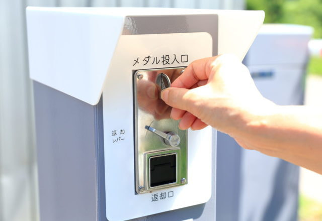 メダル収受機の投入口に入れるとゲートが開き、車両が通過できるゲートシステム。施設の駐車場などで利用者にメダルを渡すことで、利用者以外の車両の無断駐車を防ぎます。